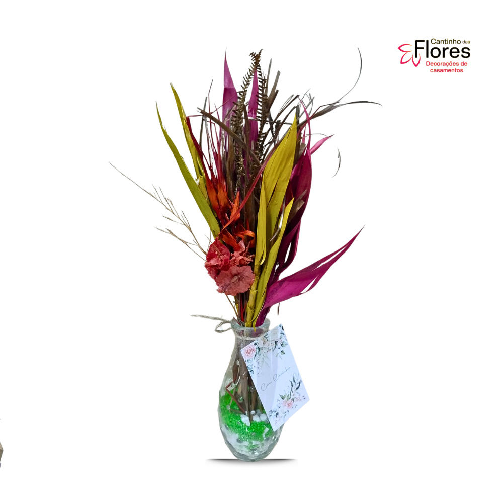Arranjo em jarrinha de vidro (15 cm) com flores desidratadas. Altura do arranjo 30 cm.