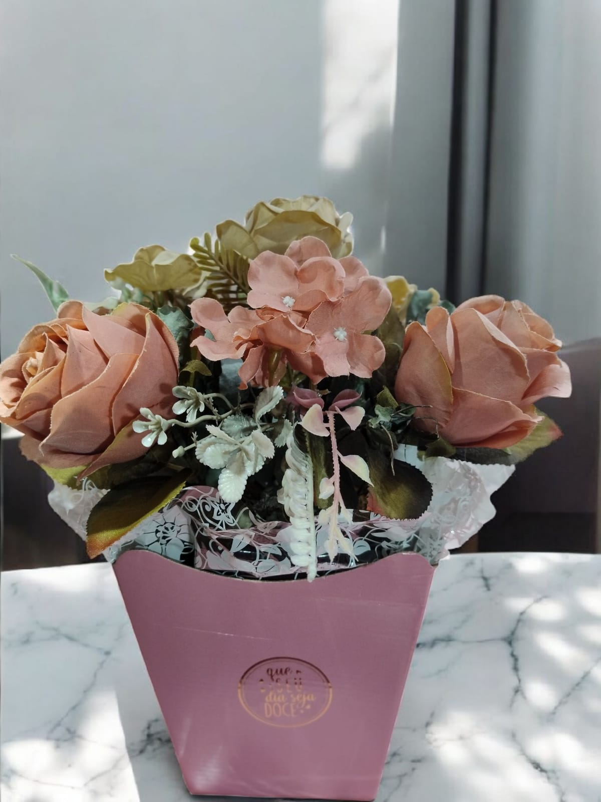 Na embalagem, acompanha o arranjo completo com vaso decorativo inclusive com detalhes em renda que acrescentam delicadeza à peça.