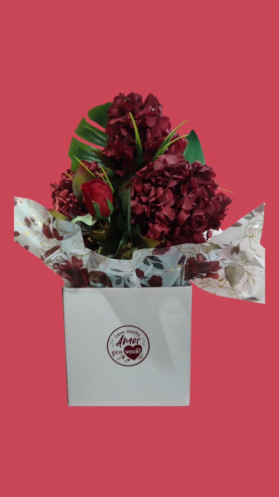 O arranjo apresenta uma combinação harmônica de hortênsias e outras flores artificiais, realçadas por uma folha grande e acabamento em papel decorativo que valoriza o produto. Todo o conjunto é disposto em uma caixa box rosa clara, com mensagem carinhosa.