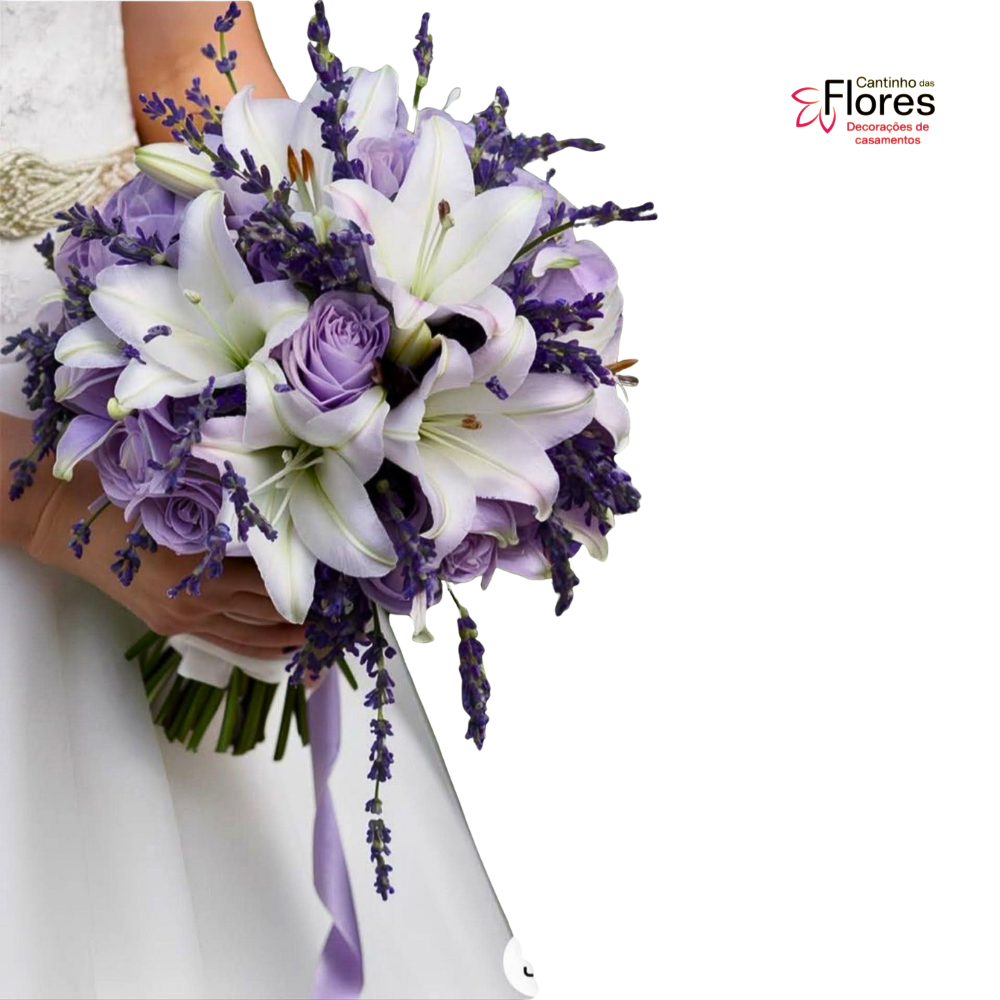 Buquê de noiva natural rosas lilás lírios brancos e complementos.