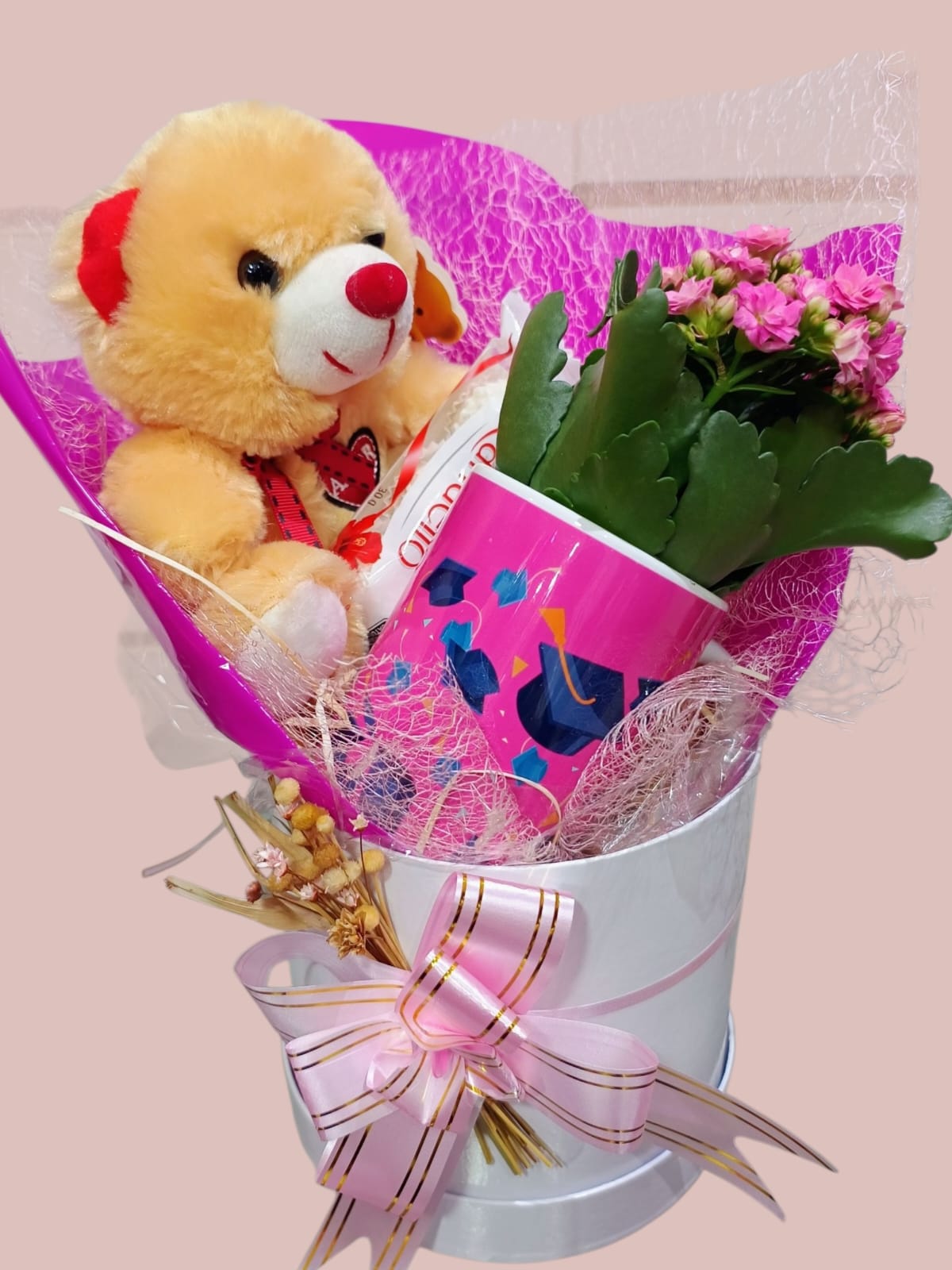 Ao adquirir, você recebe a caixa em tamanho médio contendo uma planta artificial, um ursinho de pelúcia com detalhes vermelhos, além de acessórios decorativos que valorizam a ocasião comemorativ