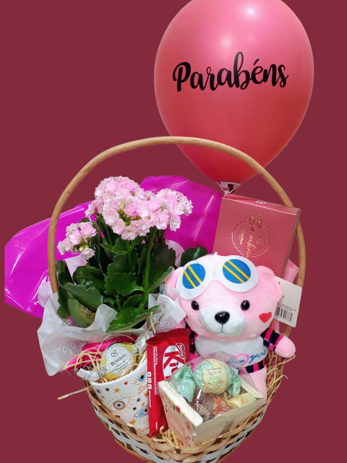 A cesta de vime em formato de coração acomoda um delicado vaso de flor natural, um ursinho de pelúcia rosa com detalhes fofo, além de guloseimas como barras de chocolate Kit Kat, bombons sortidos e uma caneca de porcelana 90 ml, com design exclusivo. Acompanhando o conjunto, um balão decorativo 'Parabéns' acrescenta mais alegria ao presente. É uma seleção pensada para oferecer conforto, sabor e emoção. Ideal para aniversários ou qualquer data especial que mereça um toque de afeto.